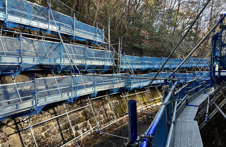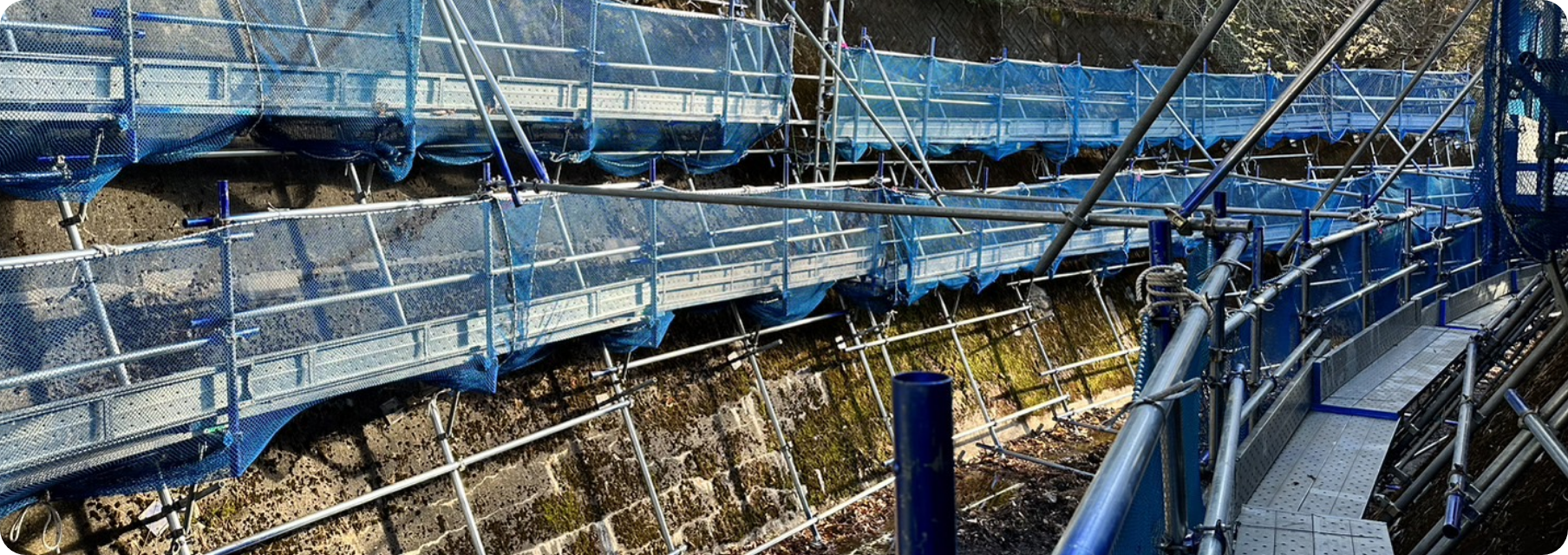 斜面の工事の際に使用される作業用足場の組立てを行います。平坦な場所での組立てではないため、経験や対応力が求められます。